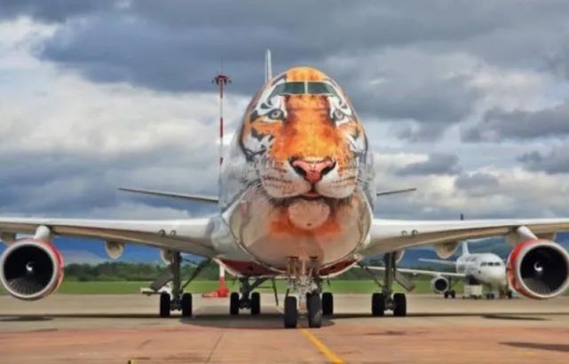 这架波音747的鼻子上喷上了一只东北虎的脸,看上去霸气十足。这架飞机隶属于俄罗斯罗西亚航空公司。他们为自己心爱的客机做这样的涂装,并不只是为了好看,更主要的是,想借此唤醒人们对东北虎这一珍稀动物的保护意识。该涂装由专业的飞机涂装公司IAC设计制作,图案基本是纯手工绘制完成,前后用了12天时间,光涂料就用了500公斤,相当于一架钢琴的重量。 - M- ]$ c4 \: I# y x