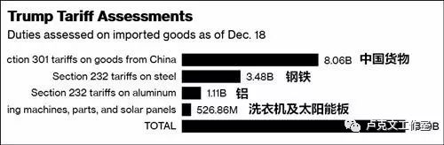 我们在《美国国债史》里分析过美国国债的构成,里面关乎着各种势力的利益,特朗普如果不想坐敞蓬车,就只能做加法,不能做减法。 我们一直把特朗普的执政方式想得太复杂,因为我们习惯了大政治家应该有无比高超的宏观谋篇布局,虚虚实实,草蛇灰线,结果特朗普总统搞钱的方式超级简单,就是想办法向世界各国加关税,或者伸手向世界各国要钱。 大家可能搞忘了,美国收关税第一枪并不是指向中国的,2018年1月,美国政府宣布对外国制造的太阳能设备和洗衣机征收关税。3月,开始对进口钢铝征收关税;6月,此前被豁免钢铝关税的欧盟、加拿大、墨西哥也加入被征税队伍。几乎同时,美国开始对中国打贸易战。 美国财政部数据,2018年全年,忙了整整一年的特朗普一共为美国政府多收了132亿美元的关税。2018年的最后三个月,美国关税收入增加了80%,比上年同期增加了83%。2019年上半年,关税收入较上年同期猛增73%至339亿美元。 特朗普关税征收情况(截至2018年12月18日) 彭博社截图